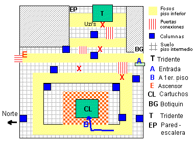 La entrada a la sala es por unas escaleras que va a parar a (A), gira a la izquierda y al pasar por la primera puerta (los pasos entre foso y foso están marcados con las líneas rojas). entra por ella y acaba con el vigilante / calavera. Vuelve al pasillo y sigue hasta pasar la columna y entra por la siguiente puerta. (Al fondo de este pasillo hay otra puerta que lleva a una sala donde el suelo parece brillar o vibrar, esta sala es un ascensor).
