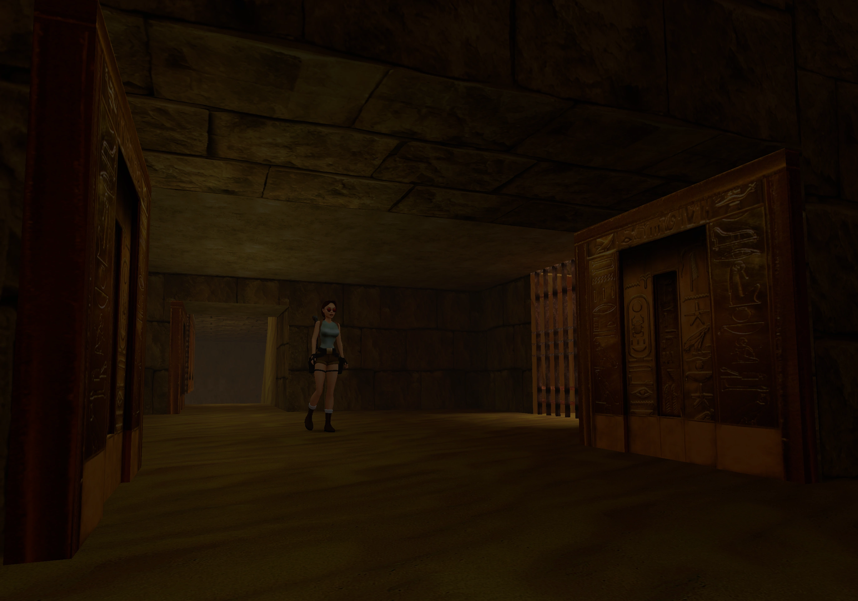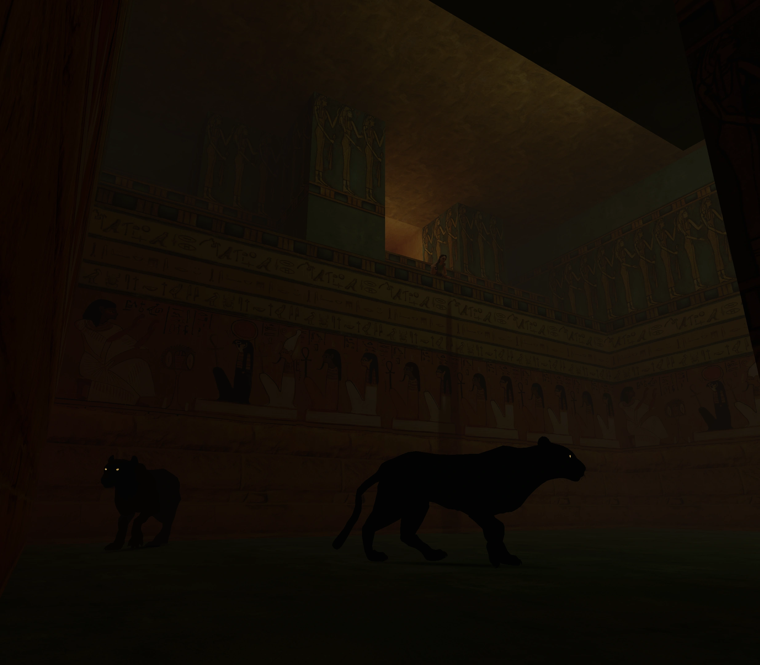 Baja al segundo peldaño al lado del Cristal de guardar y mata desde arriba a las dos panteras, luego baja con cuidado, nada mas tocar el suelo se abrirá la puerta derecha y saldrán dos panteras mas, mátalas y entra por la puerta, recoge un BOTIQUÍN GRANDE. Ahora sube por el bloque de la derecha y cruza el puente, al llegar a la plataforma central se abrirá la otra puerta de abajo, saldrán dos panteras mátalas desde arriba. Ahora, fíjate bien, en el lado izquierdo de por donde entraste a esta sala hay un hueco en alto detrás de la gata, salta hacia esa parte con carrerilla, y recoge el 3º secreto, CARTUCHOS DE ESCOPETA. Vuelve a cruzar el puente y baja al suelo, entra por la puerta que as abierto y recoge el BOTIQUÍN PEQUEÑO, ahora sal y sube al bloque de tu derecha y de este a la plataforma de arriba, entra por la puerta y sigue el pasillo hasta el final, te atacara un furioso perro momia, mátalo.