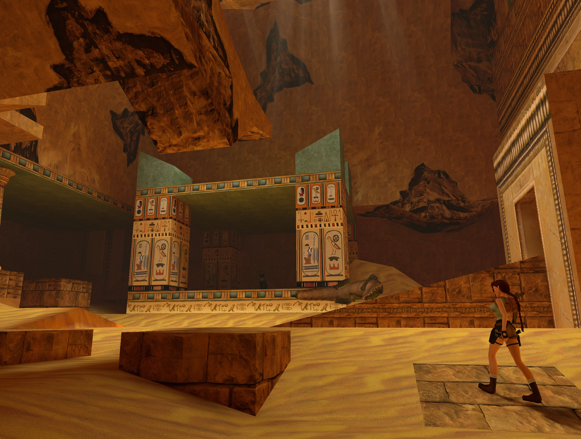 Súbete ahora al ultimo bloque derecho y camina por el túnel, al final te atacara otra pantera, mátala y continua hasta el Cristal azul, abajo veras un cocodrilo, mátalo. Baja, debajo de ti hay un túnel, ves al final y coge el BOTIQUÍN GRANDE, ahora vuelve, (No subas la rampa o te caerá una piedra rodando) y ves a la estatua del gato, mirándola de frente a la cara as de ir al rincón de la izquierda, subiendo las dunas de arena de un salto, hay en el rincón izquierdo un hueco, entra y recoge el 1º secreto, CARGADORES DE MÁGNUM y BOTIQUÍN GRANDE. Ahora salta al agua y en la zona de piedra grabada abajo hay un túnel a la derecha, nada por el túnel y al final, pared izquierda hay una palanca, (apenas se aprecia pues es del mismo color que el grabado de la piedra de la pared izquierda). Acciónala y entra por la puerta, nada rápido y sal fuera.