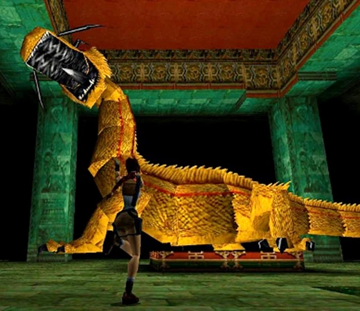 Cuando llega al templo y tiene la daga justo ante ella, se activa un mecanismo que la lleva a los confines del templo, un lugar plagado de trampas y bestias. Tras una ardua odisea, Lara consigue volver a la sala principal, pero ya es demasiado tarde. Marco Bartoli se ha clavado la daga en el corazón, y sus súbditos le llevan en volandas a una cámara donde se transformará en dragón. Lara llegará hasta él y verá su mutación. Tras una encarnizada lucha, consigue abatir al dragón y hacerse con la daga. Esta aventura se narra en Tomb Raider II: Starring Lara Croft.