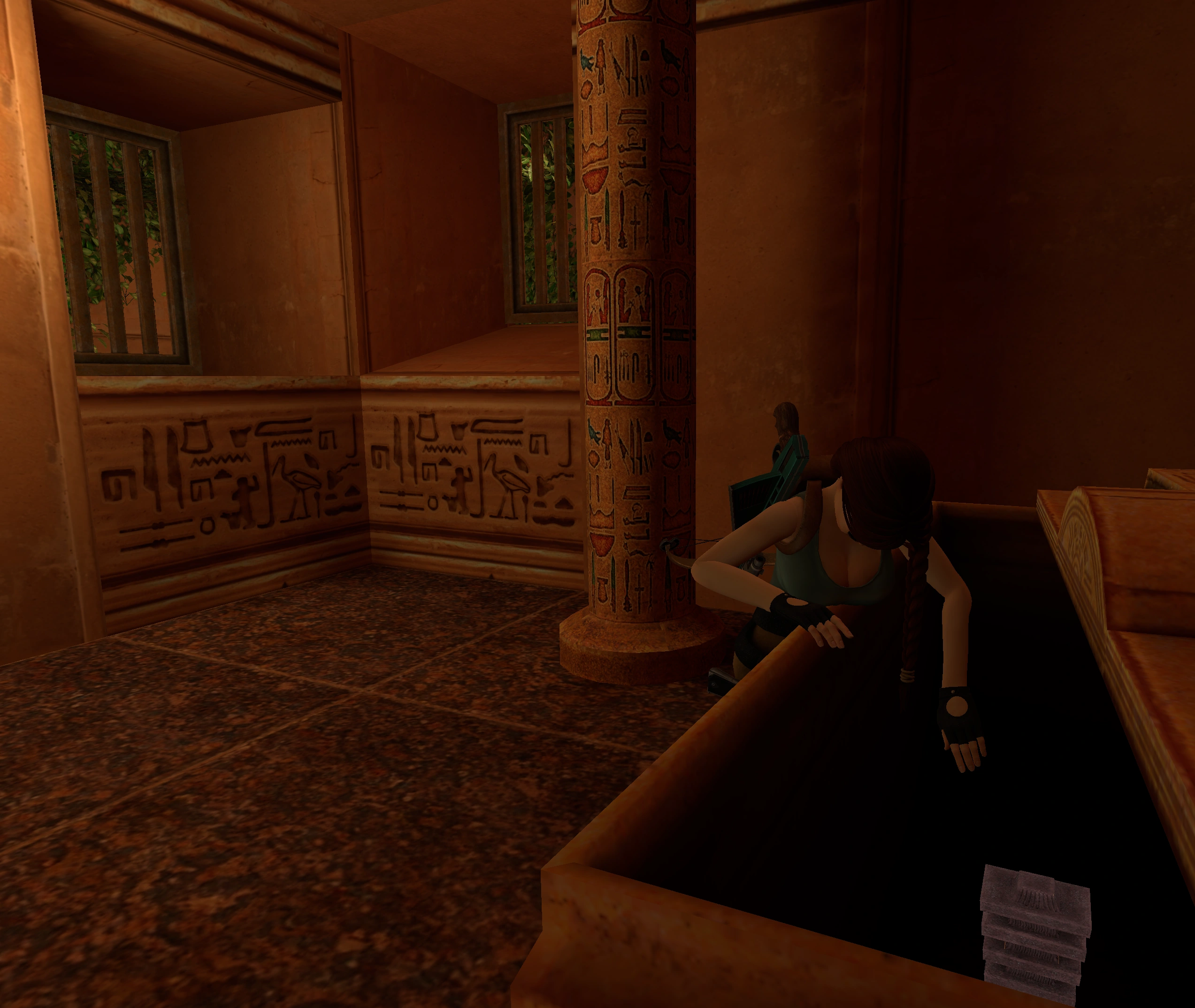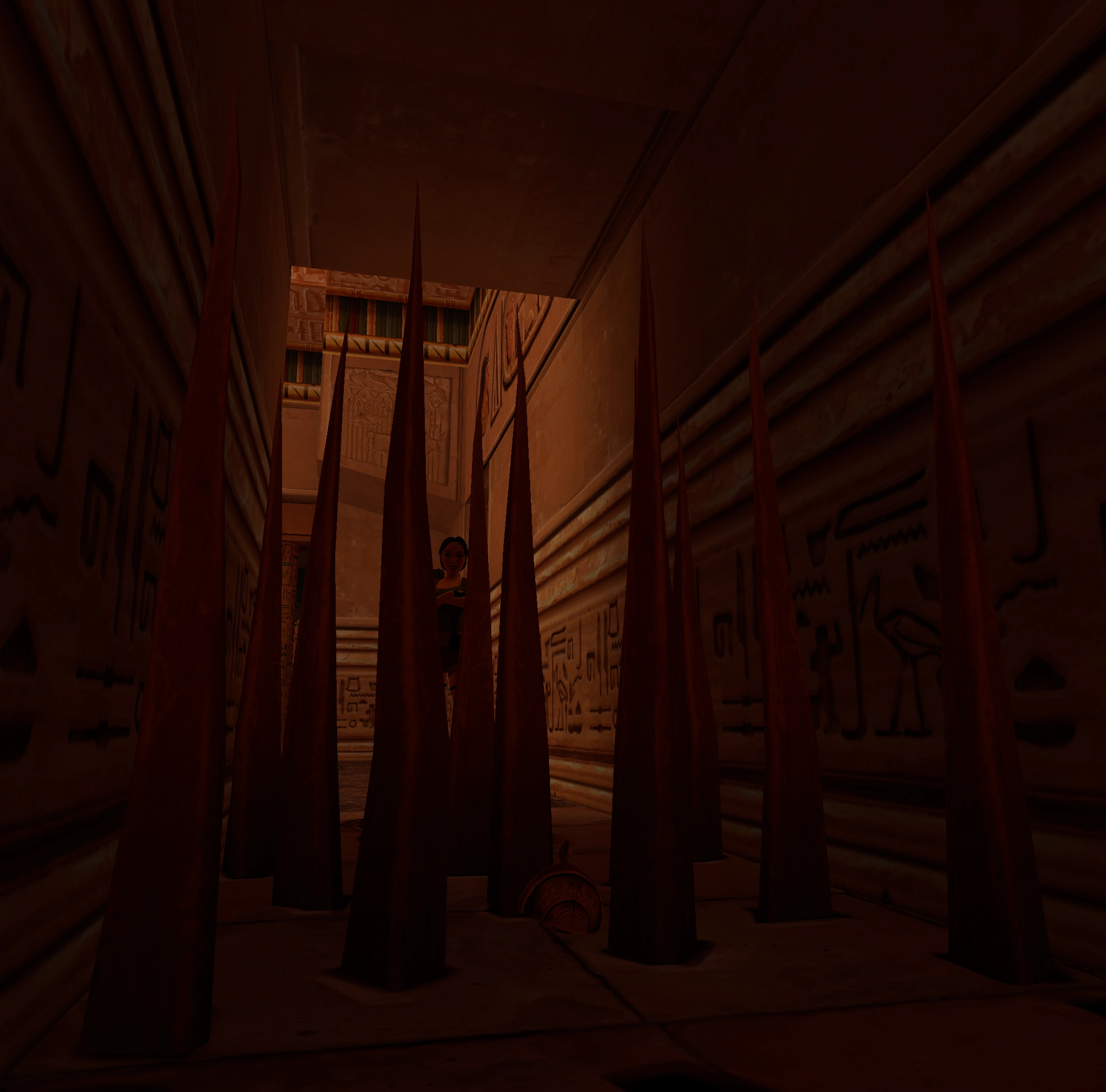 Si disparas el arcón encontrarás FLECHAS NORMALES. Ve por la rampa hasta una habitación con tijeras-trampa en la entrada. Abre el sarcófago y coge de su interior la GREBA DERECHA de la armadura de Horus. Como ya es costumbre un esqueleto aparece desde el suelo y asimismo tu puedes acabar con él. Sal de la habitación con cuidado y vuelve hacia la rampa, pero no bajes al pasillo frente a la ventada con barrotes ya que solo te llevaría a dos pasillos con pinchos y ahora ya no deberías tener el ESCARABAJO MECÁNICO que explotó tras recoger el último secreto. Por lo que vuelve el camino anterior hasta la SALA CON VEGETACIÓN Y EL SUELO HUNDIDO.
