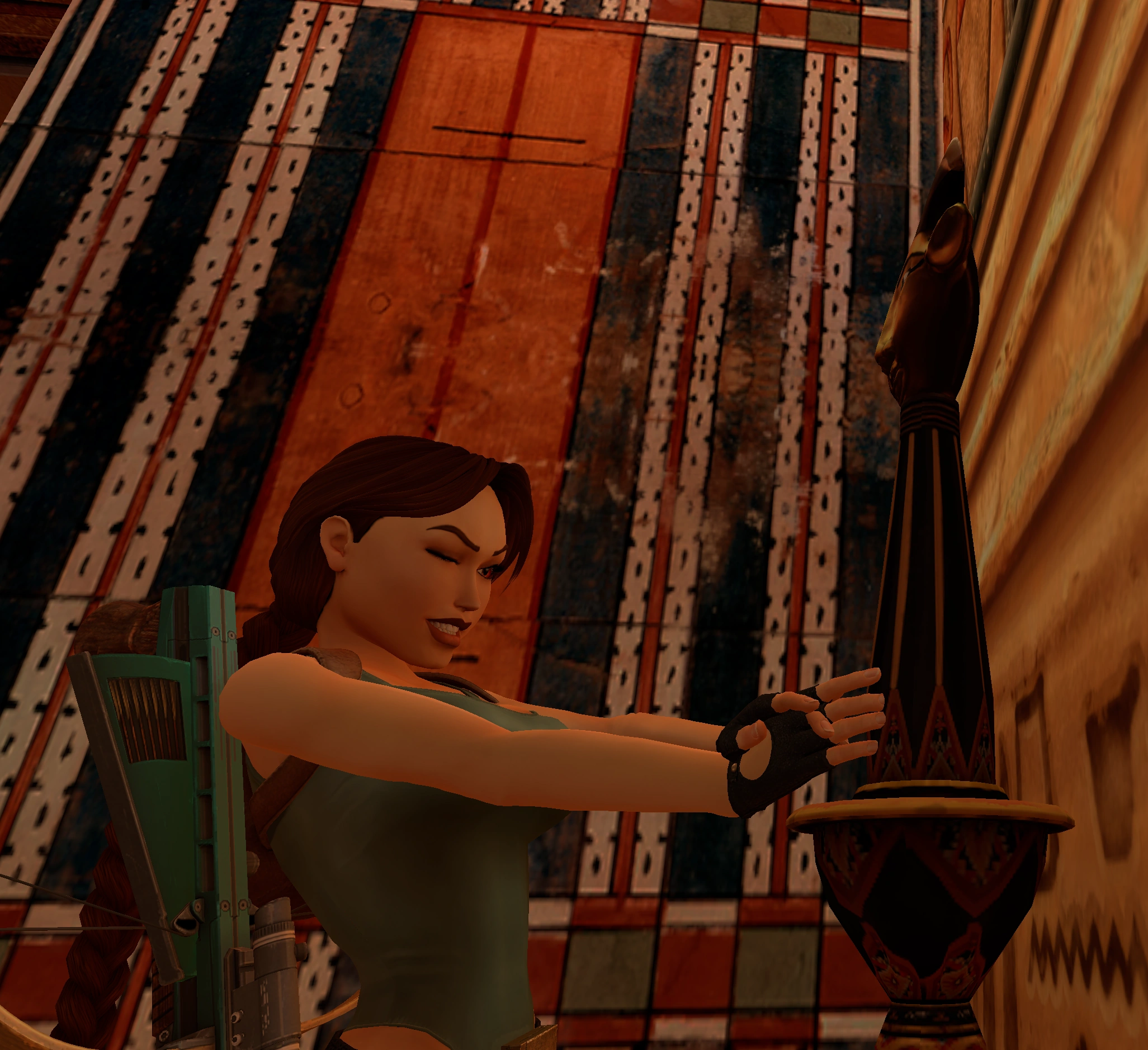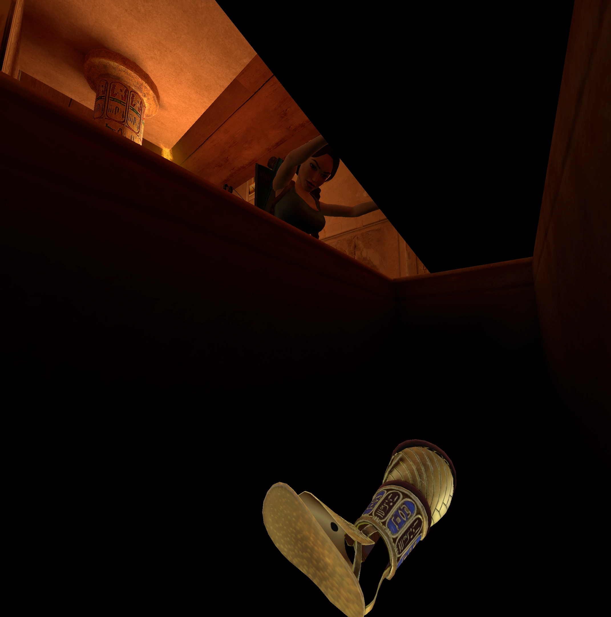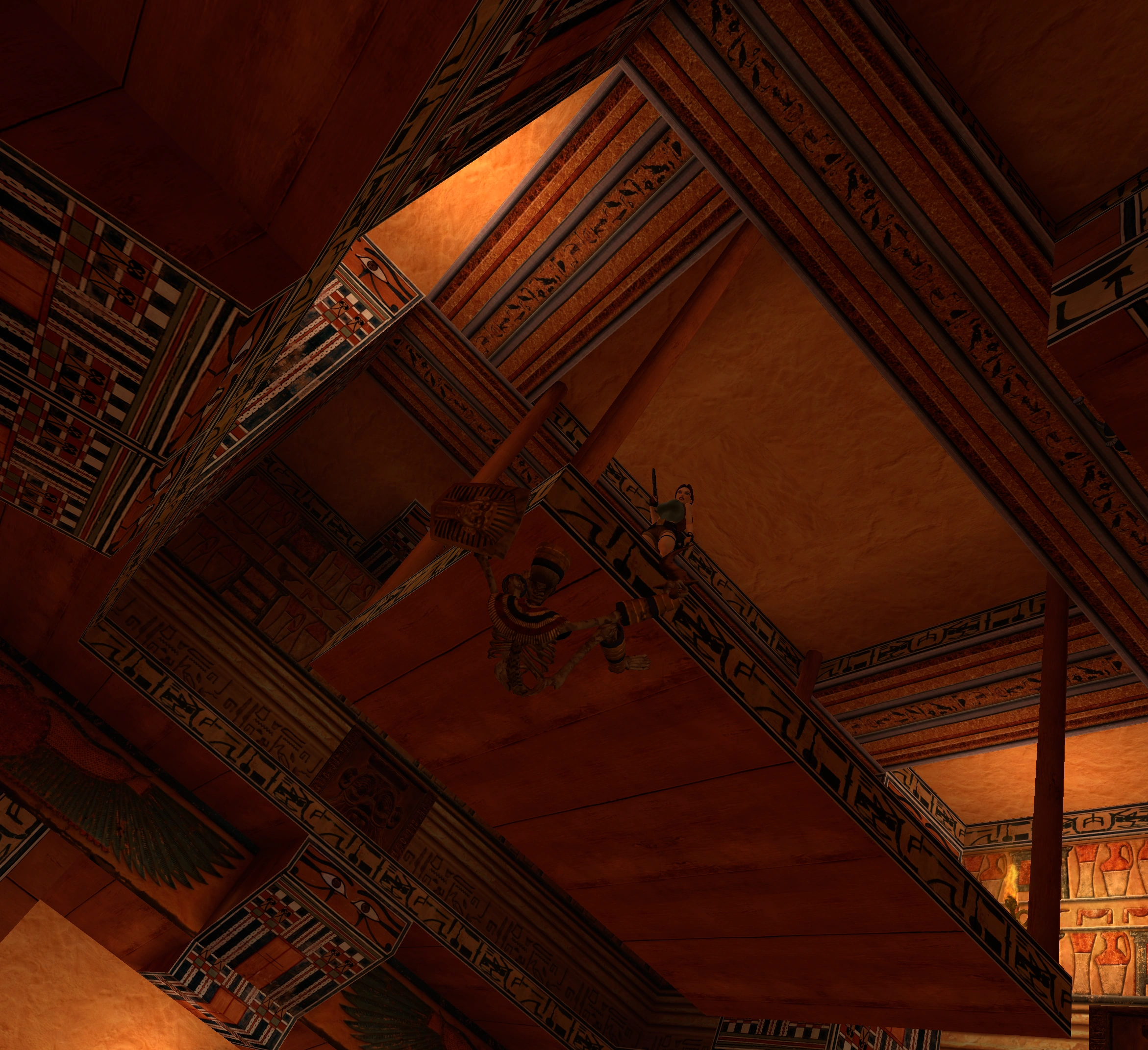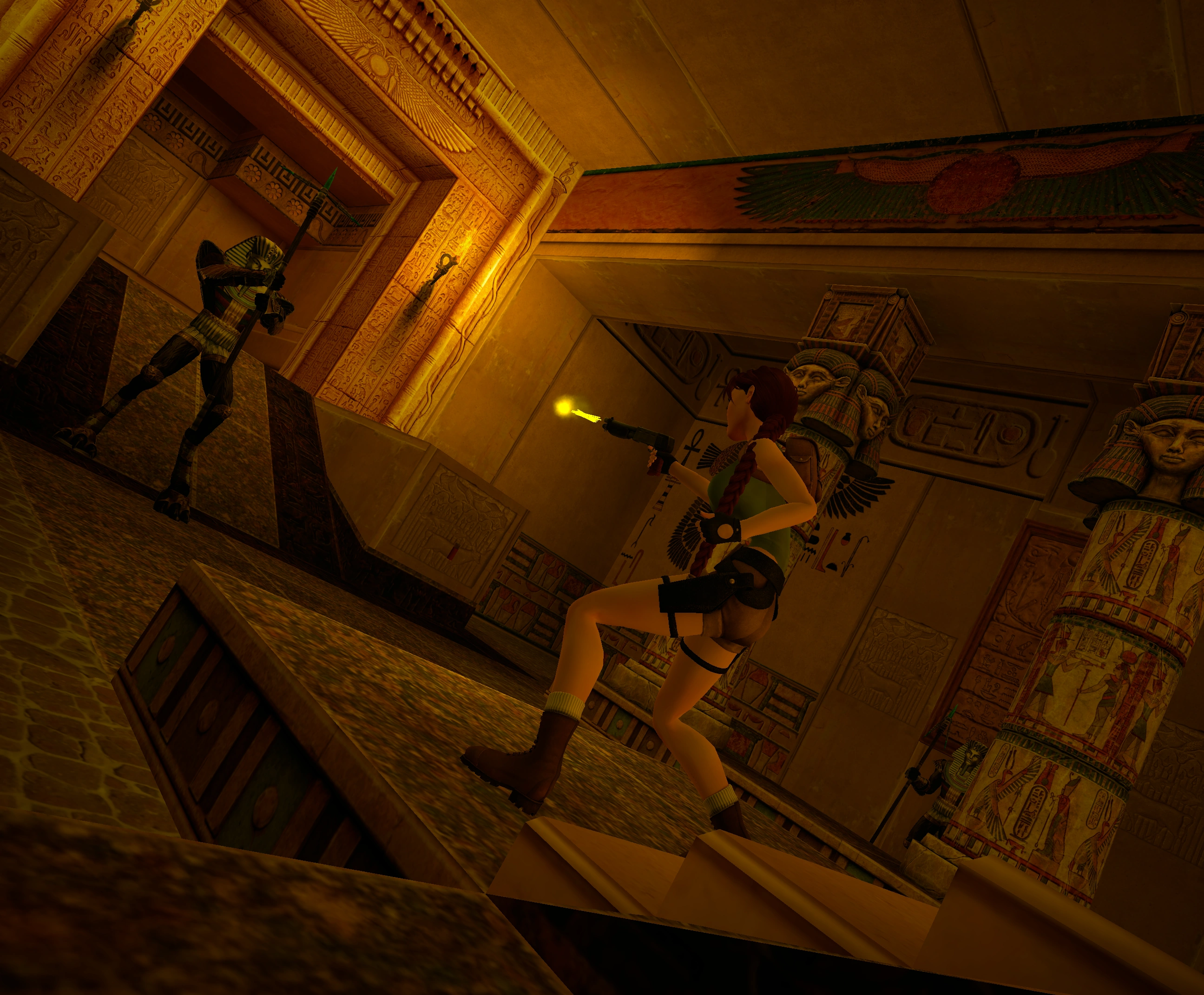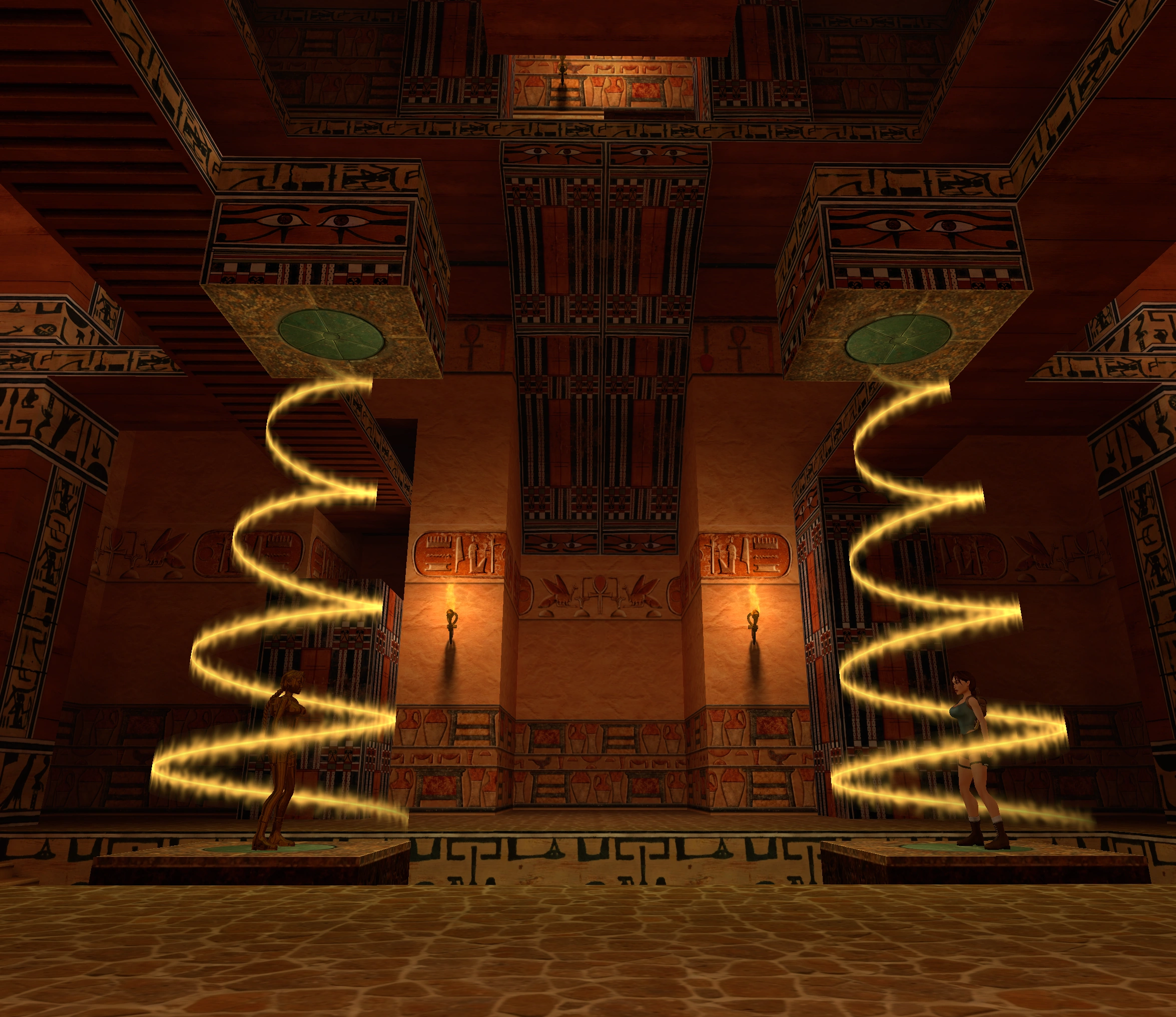 Una escena nos muestra a Lara que por su cuenta y riesgo decide interpretar "La Reina de Egipto", mala idea. Las dos puertas laterales se abren y aparecen los guardianes de la sala del trono.