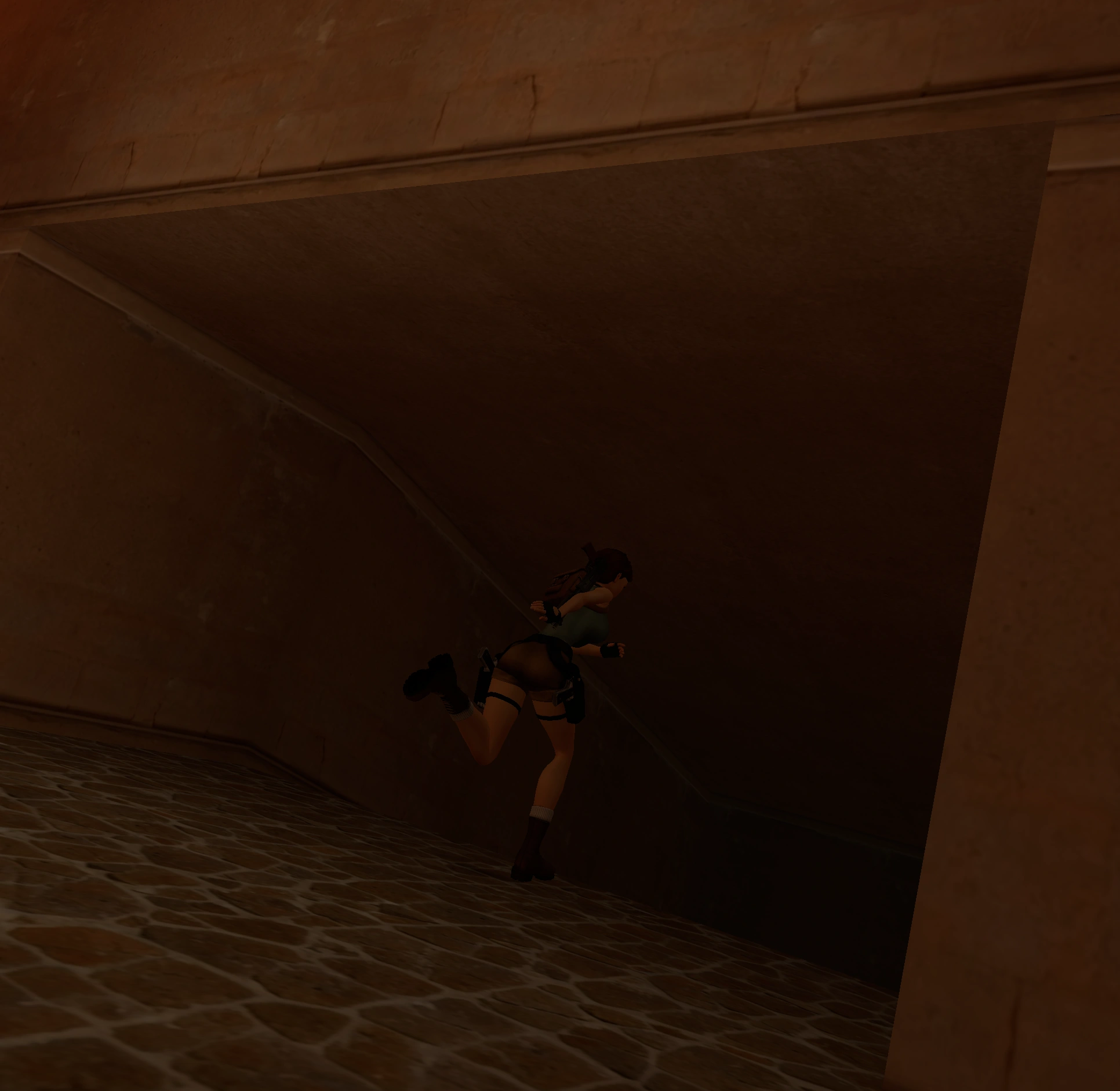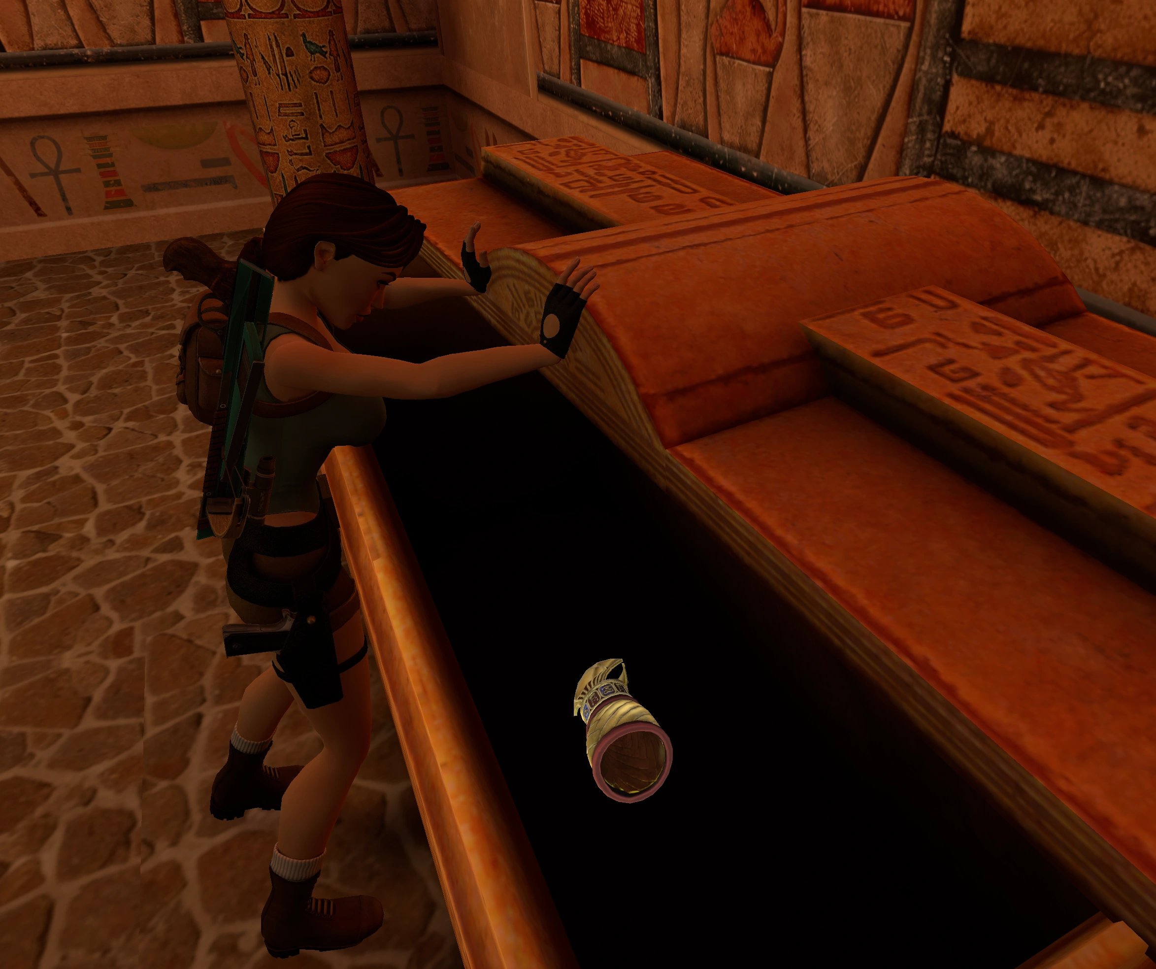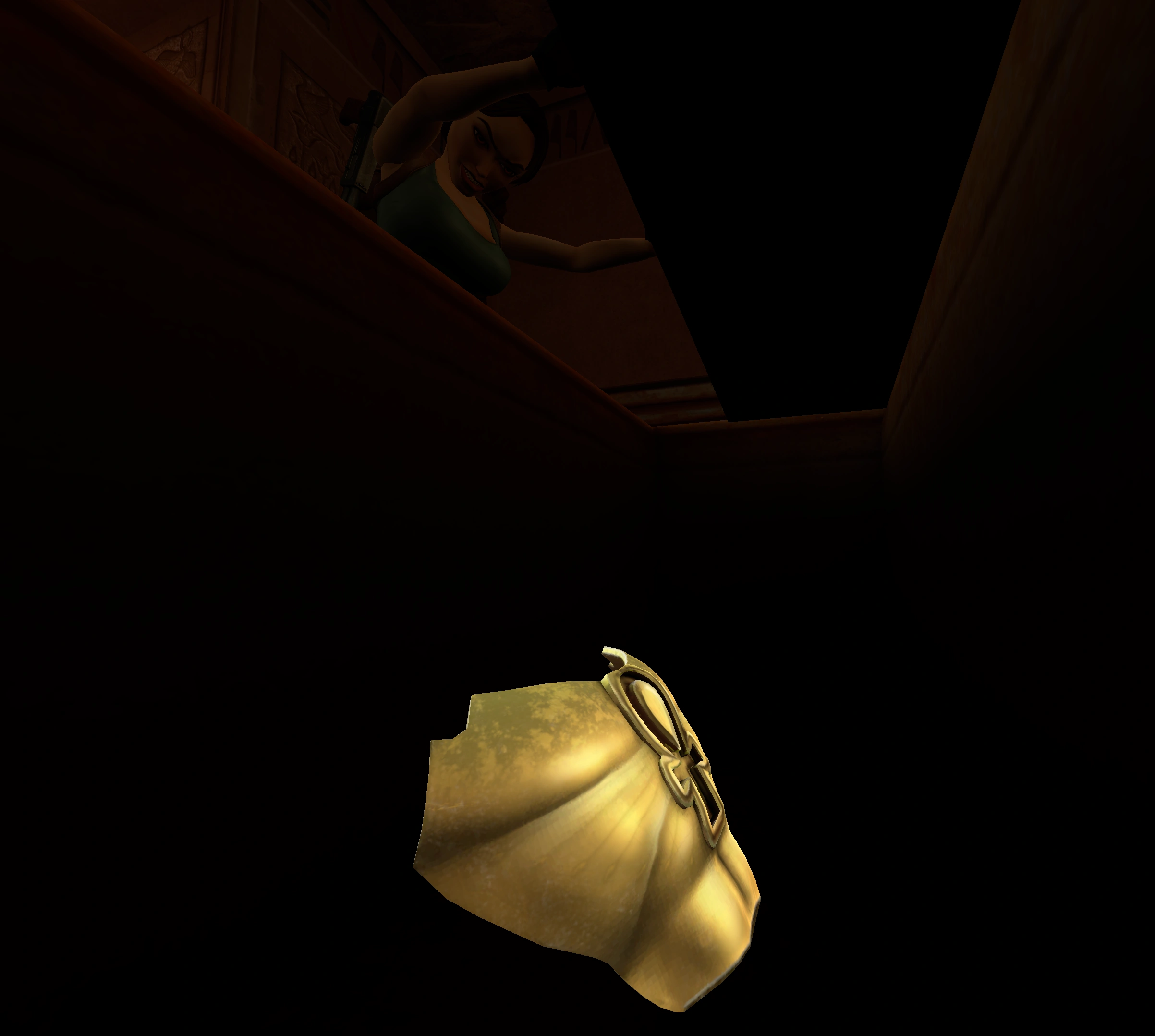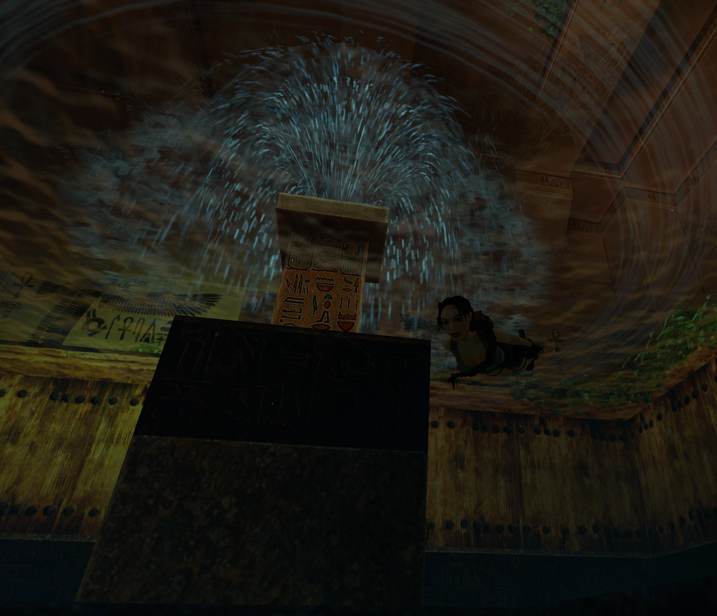 (Si tu curiosidad no te llevó la vez anterior hasta ella). Esta vez salta al agua y busca un pequeño pasaje que te llevará hasta una habitación con un nicho en la pared. Haz que Lara actúe sobre el mecanismo interior.