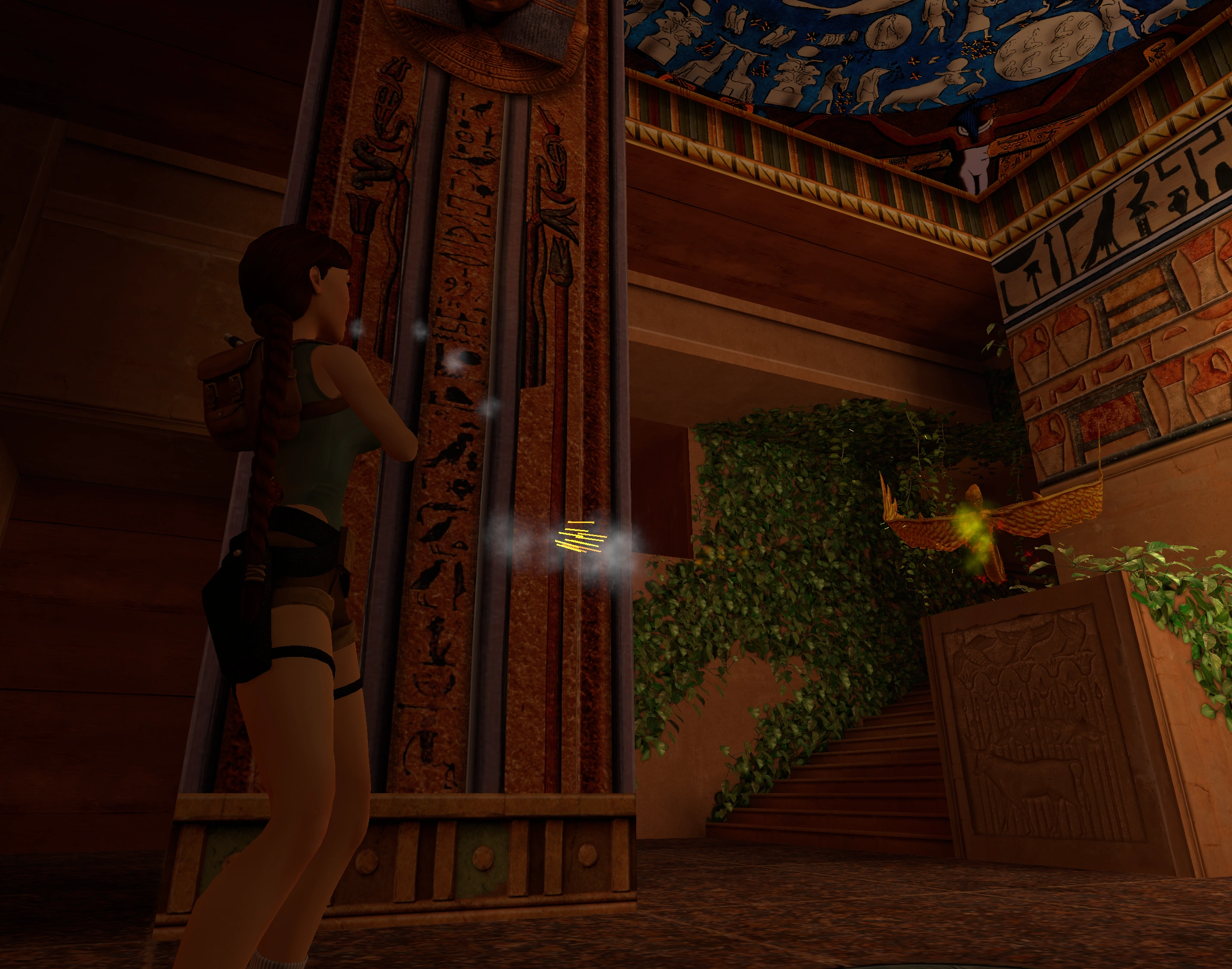 Baja los escalones hasta esta sala con dos grandes columnas y diferentes pasillos por donde ir. Cuando Lara llegue a la parte central (aprox.) un pájaro dorado aparecerá por donde acabas de bajar. Utiliza una flecha explosiva para acabar con el.