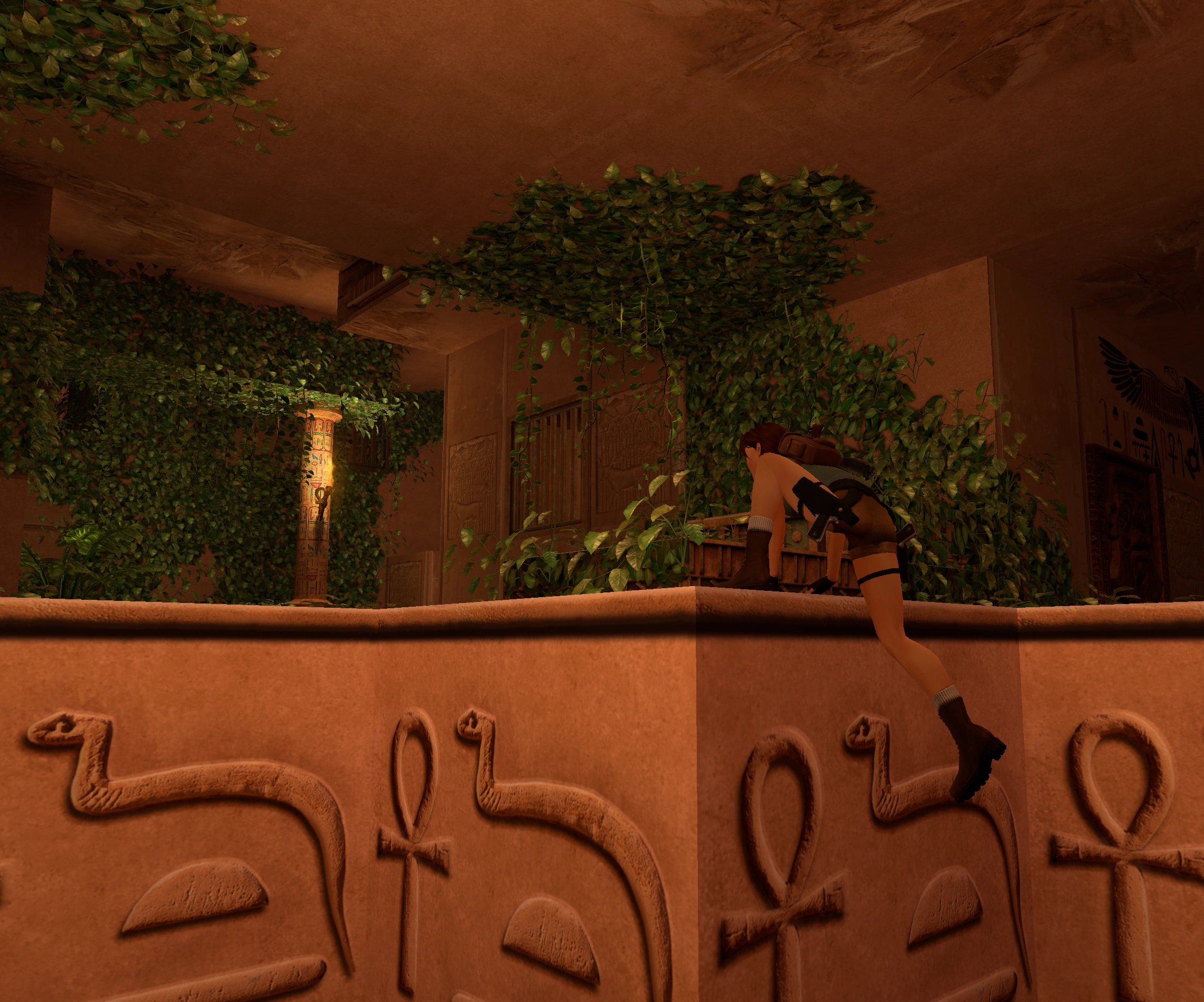 Llegarás por unos escalones una habitación con plantas y dos puertas. Dirígete a la puerta situada a la izquierda (Norte). Verás que tiene una serie de jeroglíficos esculpidos a su alrededor y te lleva por una rampa hasta otra habitación cuya entrada es una TRAMPA de tijeras, por lo que entra rápidamente. Sitúa a Lara frente al arcón o sarcófago y pulsa (Ctrl) para que recoja el GUANTE DERECHO, de la armadura de Horus. Al hacerlo despertará el esqueleto guardián que te atacará por la derecha. Dedícale una flecha explosiva o una granada. Sal de la habitación con cuidado de que no te parta en dos las tijeras y vuelve a la anterior habitación.