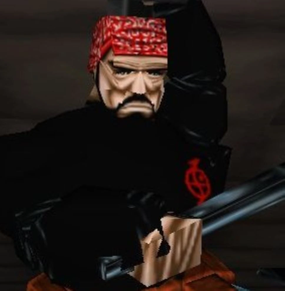 Eros se préparant à frapper Lara Croft dans l'hydravion de Bartoli à Venise dans Tomb Raider II.