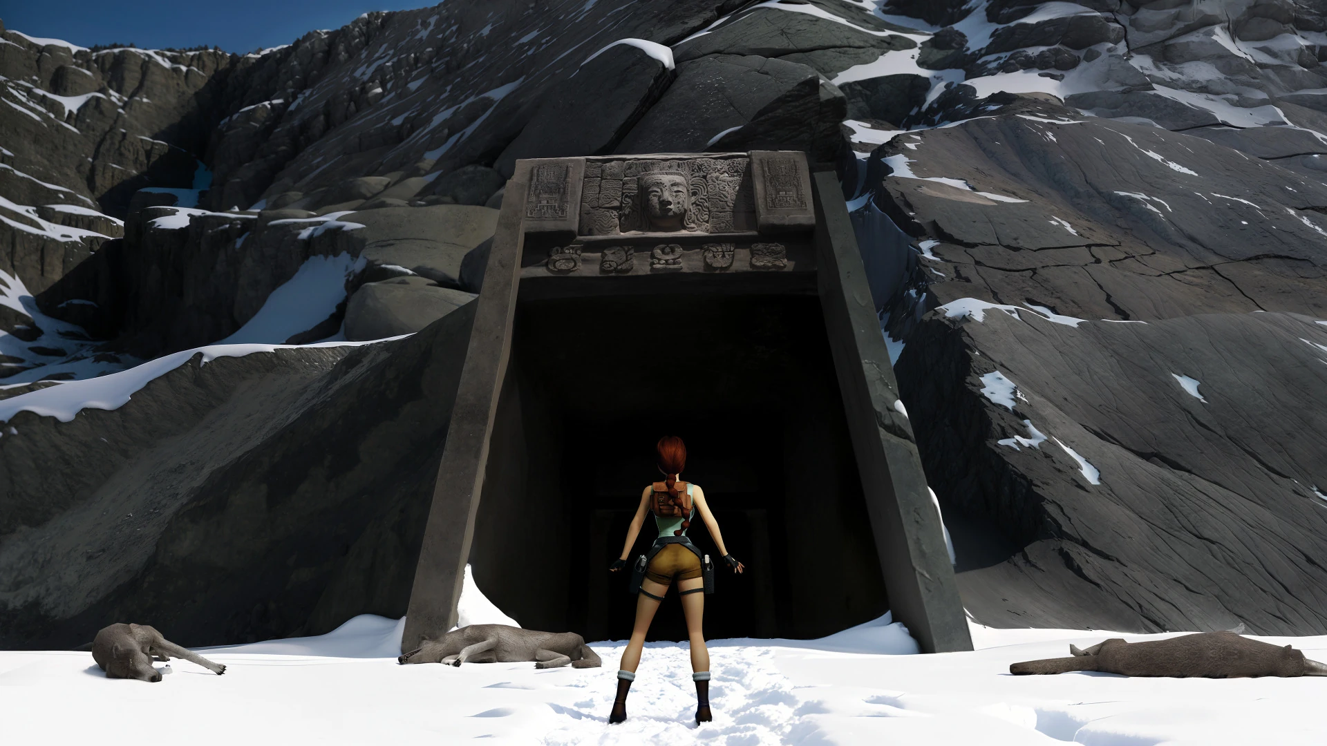 Tandis que Lara pénètre dans le temple, les portes se referment derrière elle. Lara suit alors les empreintes de pattes des loups dans la neige puis découvre des fentes dans les murs avec un piège à fléchettes. Elle doit continuer à courir pour les passer avec peu ou pas de dégâts.