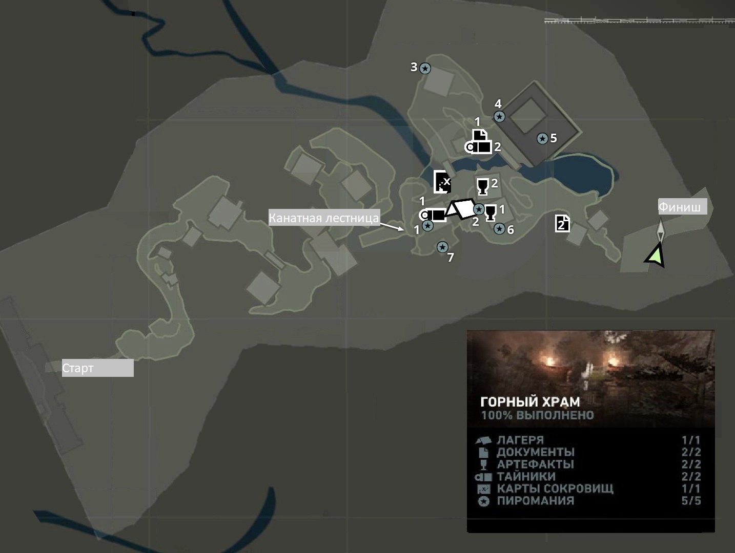 Лагерь: Горный храм (доступен быстрый переход) Оружие: полуавтоматический пистолет Документы: 2 Артефакты: 2 Тайники: 2 Карта сокровищ: 1 Испытания: 1 (5 предметов)*