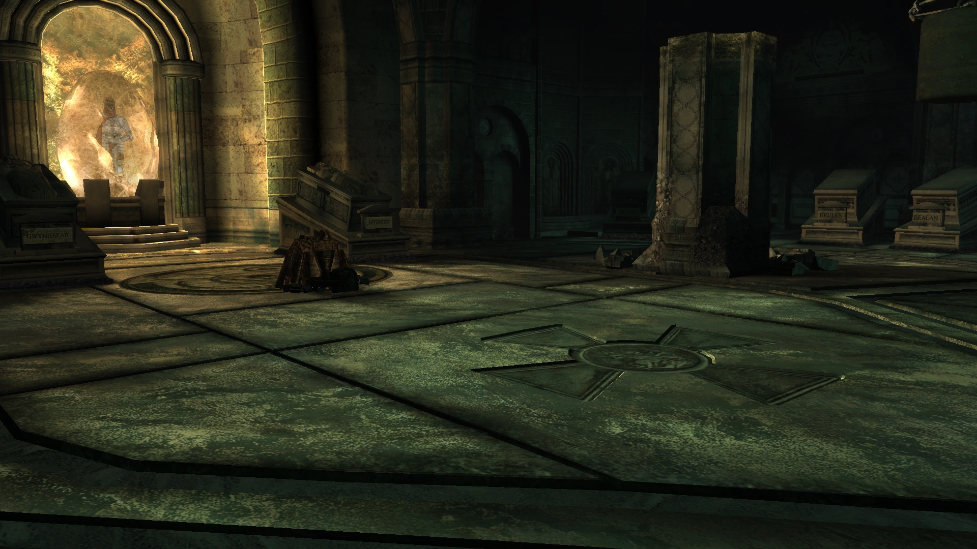 Inside the tomb Myrrdin and Gwynhafar are burid next to Arthur's crystalline tomb. The members of his round table are buried around the tomb in almost circular fashion. The coffins of Ector, Pellynore, Brulen, Bealan, Trystan, Bedwyr, Kei, Gauvain are full; but Llenlleawc, Perlesvaus, Gwalchaved, Bors are empty as they were the ones who went after the Holy Grail.[1]