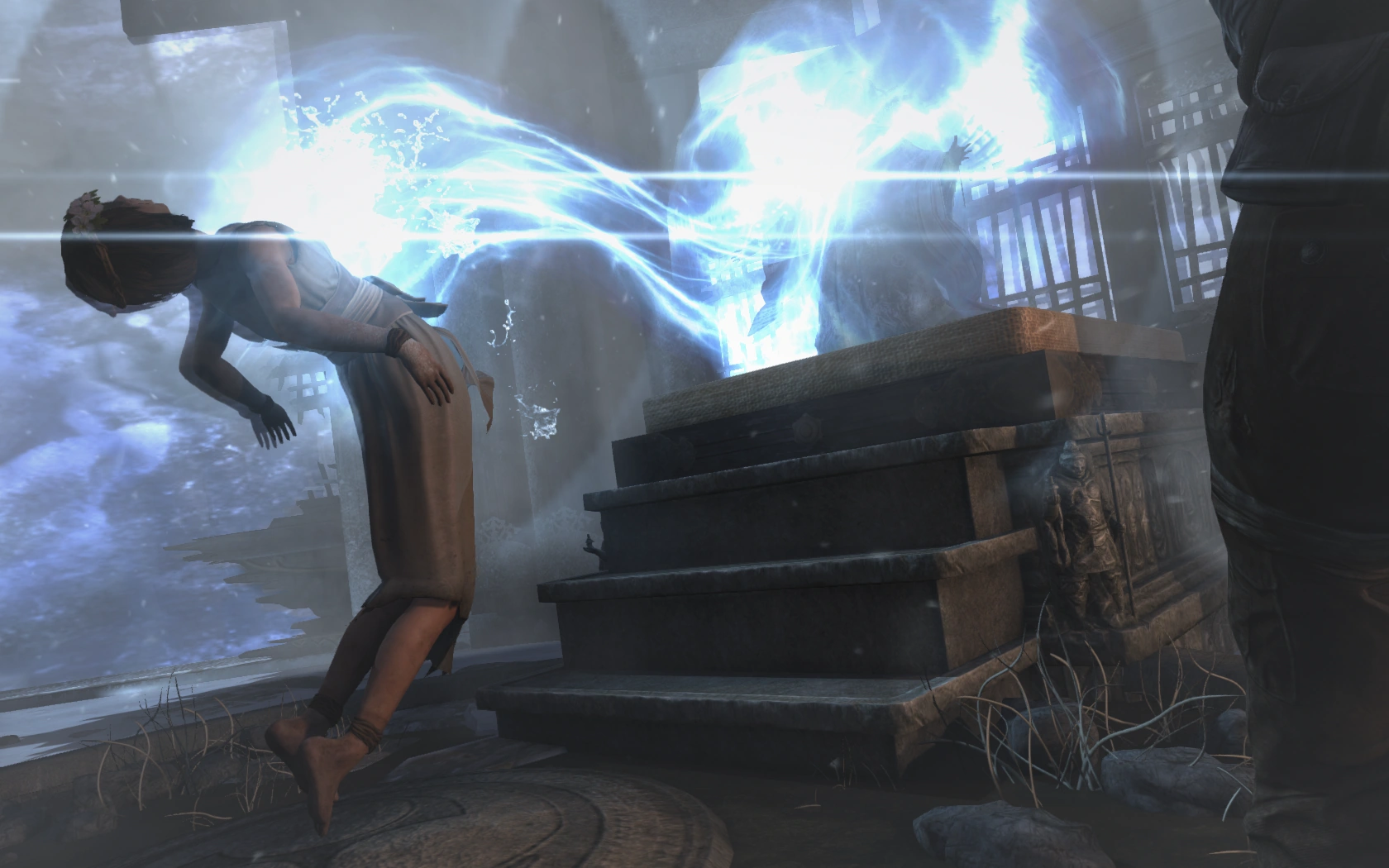 Lara catches up to them, after a while, and Mathias holds Sam at the behest of his bladed staff, to keep Lara from coming any closer. However after lightning strikes causing a fire, Lara is cut off from them, and Sam is taken to the top of the monastery.