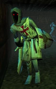 The Templar Knights are undead knights. They have a tattered, dull grey/blue appearance. They have red glowing eyes and when shot, they emit dust clouds. They wear helmets, armour on their arms and torso, long boots and hold swords and shields.