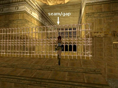 FENCE BUG SHORTCUT: In the FLOODED CAVE WITH SPHINX & OBELISK near the beginning of the level, you can take a shortcut to the SHOTGUN by using the fence bug to run through at one of the seams, like the one shown in this screenshot to the right. However, if you want all the kills, this actually ends up taking longer than the normal route.