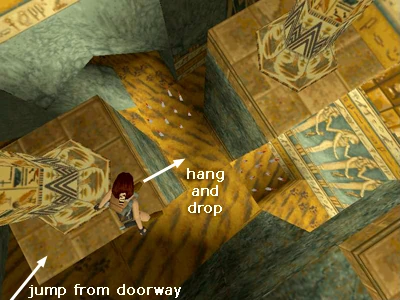NOTE: If you're playing the PC version of the game and want to get up inside the building with the silver symbol of Hathor, you can download Jeff Reid's patched savegames. The 5th save in the group for level 1 will put Lara there. From that spot you can get to various interesting spots at the top of the room.