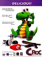 A promotional image for the game Croc: Legend of the Gobbos featured the titular character near slightly modified versions of Crash Bandicoot's shoes, Mario's cap (featuring an 'N' instead of 'M') and Lara Croft's guns, while he's using a toothpick, suggesting he just ate the three characters. The advertisement also cites three articles from gaming magazines that positively compared Croc to the Tomb Raider, Mario, and Crash Bandicoot games.