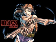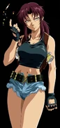 In this manga/anime, the character of Revy, real name Rebecca Lee, is a mercenary. She is the female second protagonist of this series, and seems to be based on Lara Croft in terms of appearance and capabilities. Like Lara Croft, she has brown hair worn in a ponytail and amber-brown eyes. She wears a black crop top, short, a belt, military-style boots, finger-less black gloves, and holsters for her two pistols. She is beautiful and has a temper. She is an outstanding marks-woman and expert in weaponry, being able to use a multitude of weapons, such as pistols, machine guns, grenade launchers, submarine rifles etc.. Because of her ambidextrous sharpshooting skills with her two pistols, she is nicknamed "Two Hands". She also rides motorcycles.
