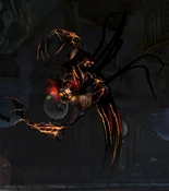 Amanda summoned the creature again to attack Lara as they both tried to obtain a fragment of Excalibur from a facility in Kazakhstan. Amanda's summoning ritual showed her holding the stone with her hand and rolling her eyes back until only the whites of her eyes showed. The stone was glowed with a dark, red, ominous, smokey energy as the Unknown Entity slowly appeared to form itself out of thin air. The creature, full formed and summoned, used its demonic arms to claw its way around the facility's large room. She warned Lara to stay out of its way and that it would “kill anything in its way.” The entity attempted to claw and slice at Lara. It also showed the ability to charge and ignite small, fiery explosions on the ground. During this altercation, Lara discovered that the creature was vulnerable to strong electromagnetic fields. She used the Tesla coil gun to seize the ghostly creature and force it into large electrical arc that was part of the KGB experiment. When she did this the creature roared in pain and dissolved into a cloud of smoke before disappearing altogether. This was only temporary though as the entity would reform shortly after and continue to hunt her. Lara was able to fend it off long enough to retrieve the sword fragment from the experiment. Afterward, Amanda called the creature back and escaped the facility.