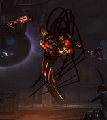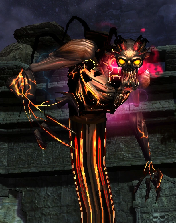 The Unknown Entity resembles a ghostly, demonic creature with a torso hosting no legs, two large, muscular arms tipped with long claws, and a skull-like head with glowing, featureless eyes and sharp teeth. Its entire body is formed by a substance that resembles black smoke with fiery, red embers floating throughout. Its bottom section resembles a long tail that extends under its torso and gradually fades into nothingness. Throughout its incorporeal body it features veins of glowing energy. The color of these vein-like segments changes from orange-red to pinkish-purple depending on its form. It also has a number of long dark tendrils protruding from its back that whip around and disappear in a ghostly fashion as it moves around.